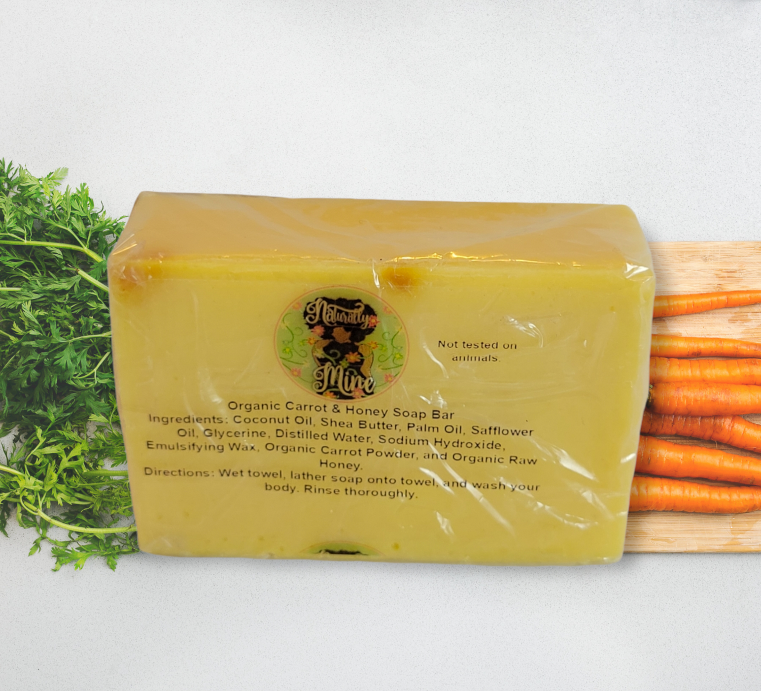Ingredients: Coconut Oil, Shea Butter, Palm Oil, Safflower Oil, Glycerine, Purified Water, Sodium Hydroxide, Emulsifying Wax, Organic Carrot Powder, and Organic Raw Honey.