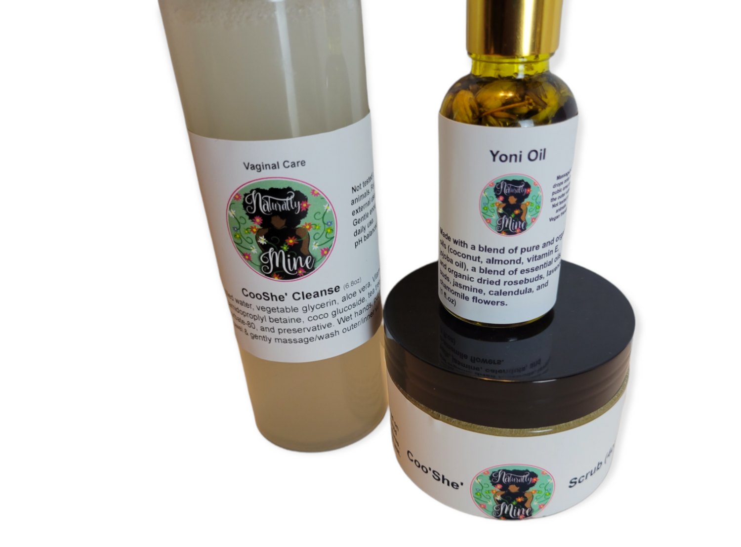 Made with a blend of pure and organic oils (coconut oil, almond oil, Vitamin E oil, jojoba oil), tea tree oil, lemongrass essential oil, ylang ylang essential oil, jasmine essential oil, organic rosebuds, organic Lavender buds, organic chamomile, organic calendula, and jasmine buds.