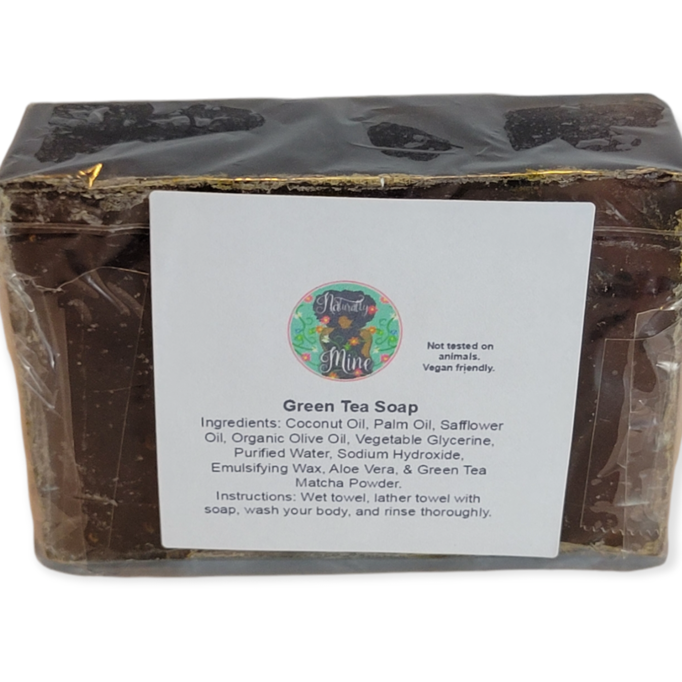 Ingredients: Coconut Oil, Olive Oil, Stearic Acid, Sodium Hydroxide, Vegetable Glycerin, Organic Matcha Green Tea, Aloe Vera, and Tea Tree Oil.