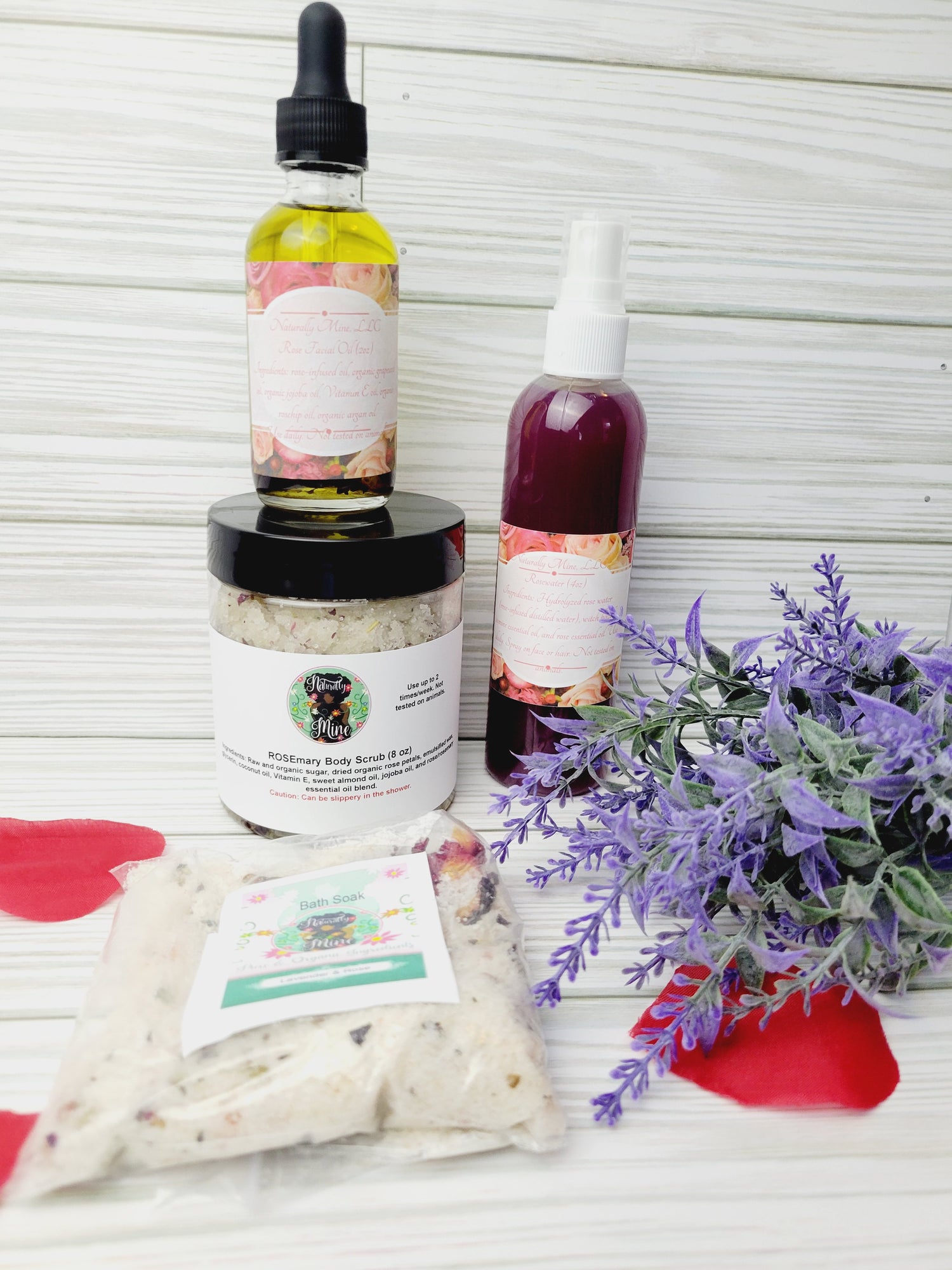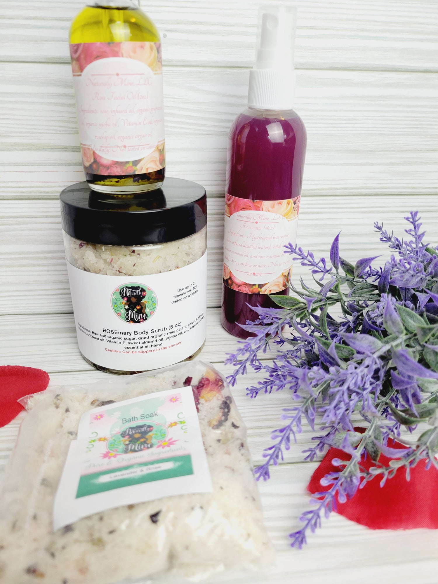 Made with raw and organic sugar, emulsified wax, coconut oil, Vitamin E, sweet almond oil, jojoba oil, rose essential oil, rosemary essential oil, organic dried rose petals, and organic dried rosemary.
