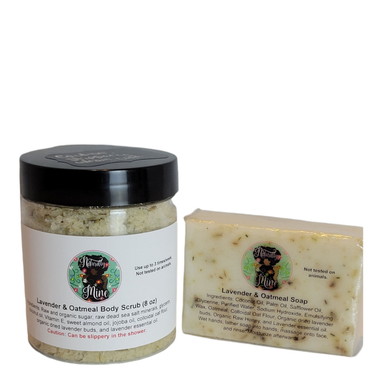 Ingredients: Raw and organic sugar, raw dead sea salt minerals, Organic dried lavender buds, Oatmeal, Colloidal oats, emulsified wax, coconut oil, grapeseed oil, Vitamin E, sweet almond oil, jojoba oil, and Lavender pure essential oils.