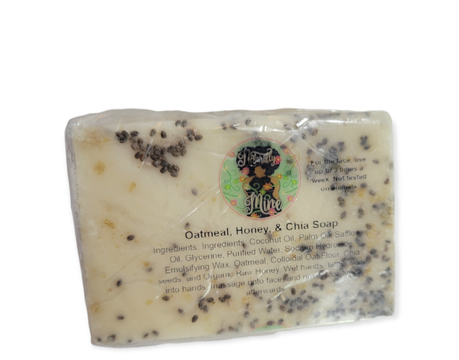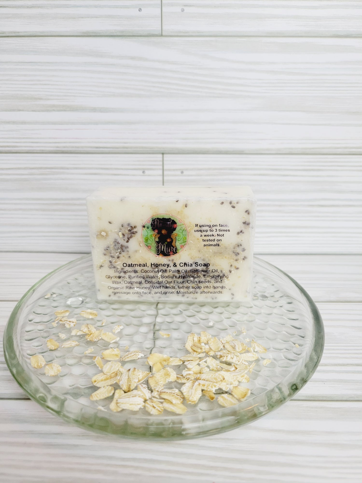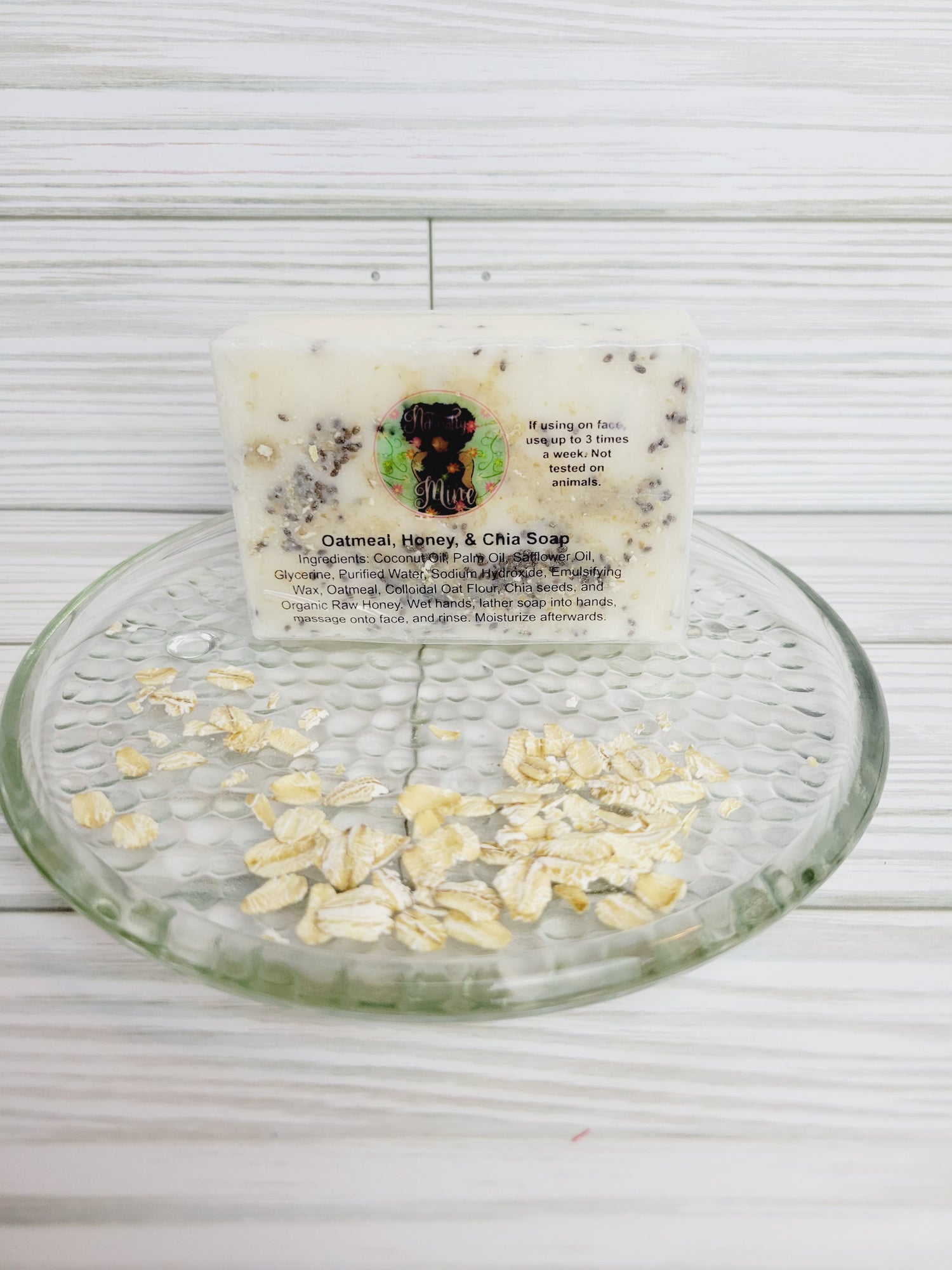 Ingredients: Coconut Oil, Palm Oil, Safflower Oil, Glycerine, Purified Water, Sodium Hydroxide, Emulsifying Wax, Oatmeal, Colloidal Oat Flour, Organic Chia Seeds, and Organic Raw Honey.
