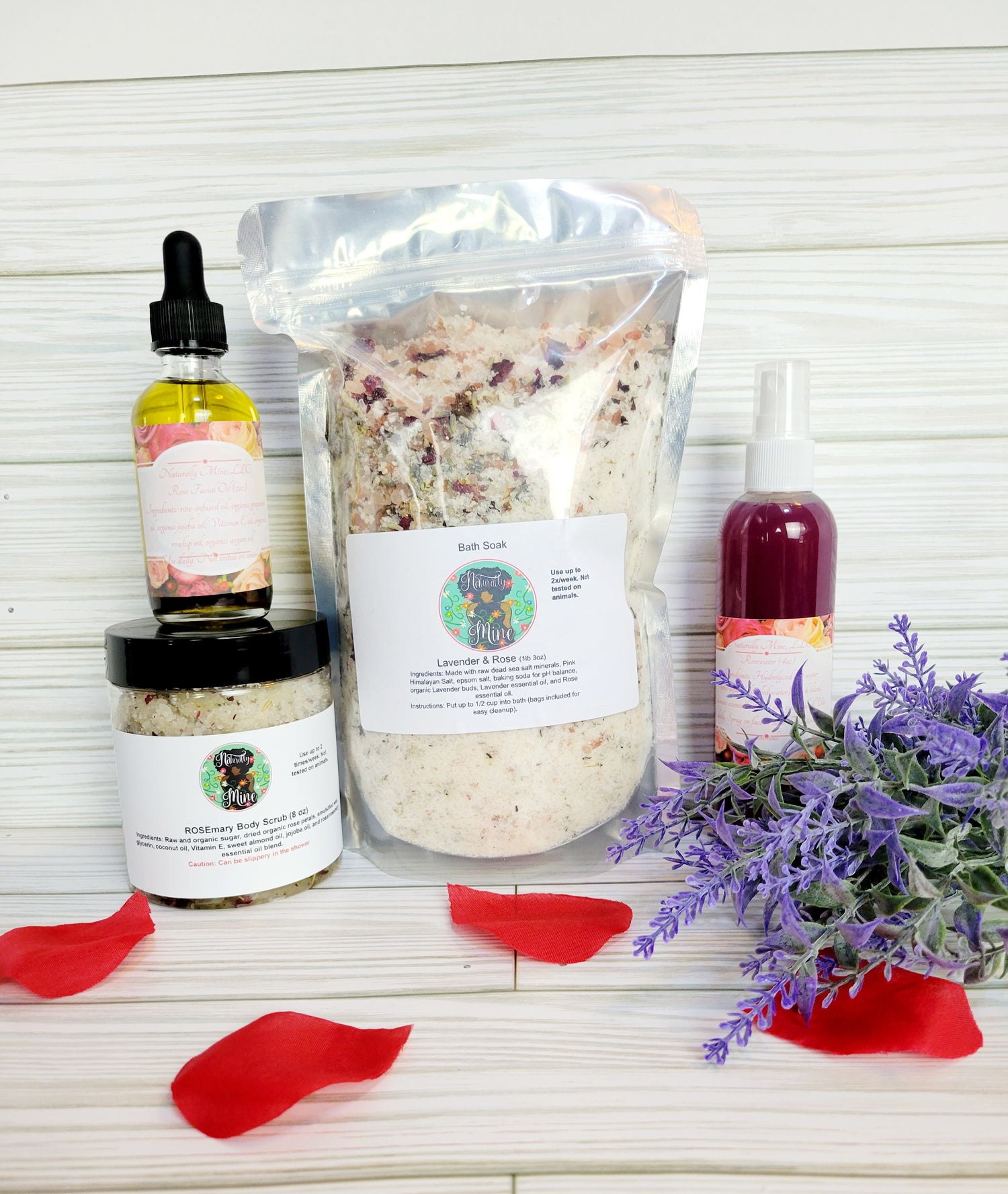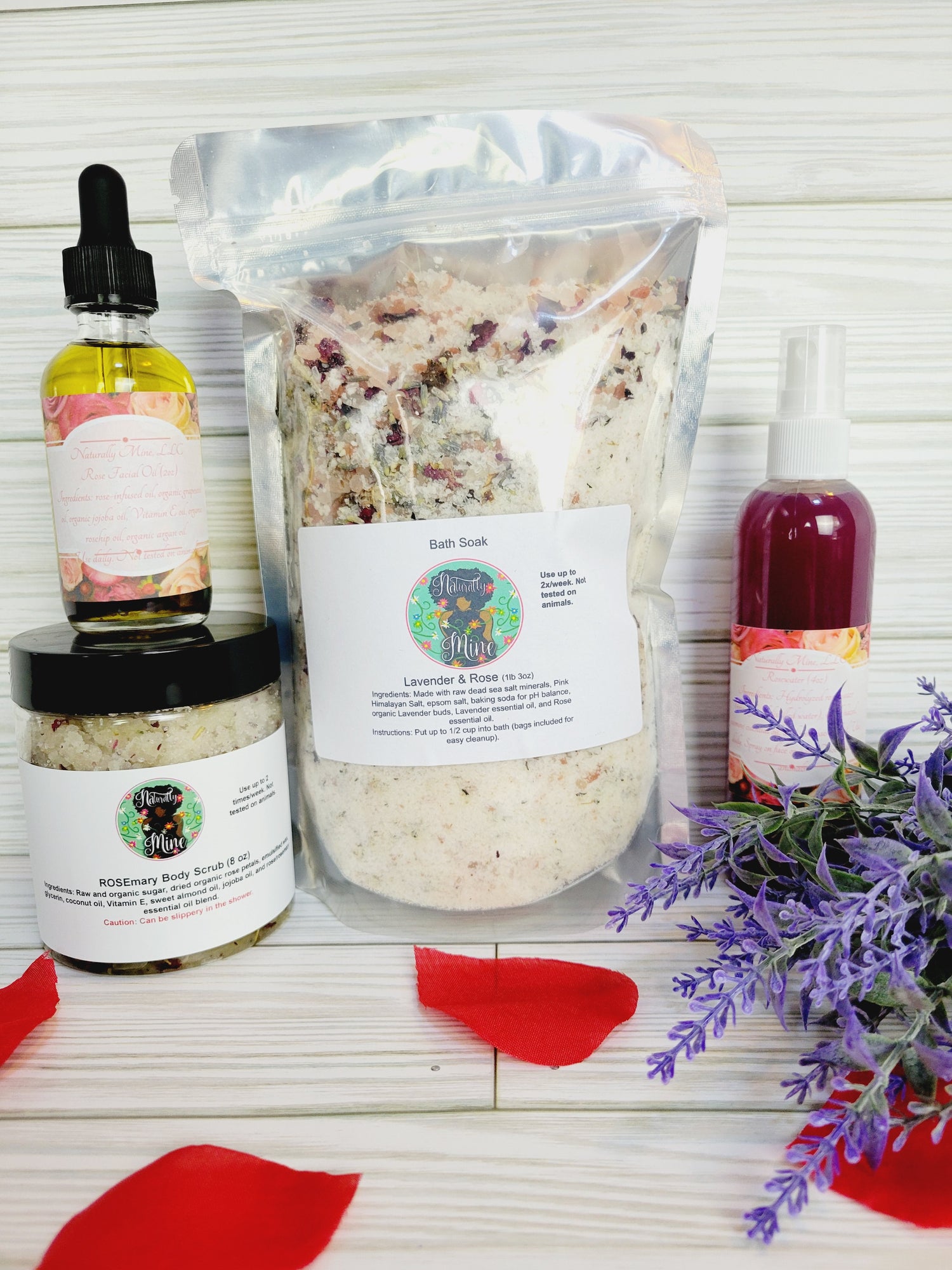 Made with raw dead sea salt minerals, Pink Himalayan Salt, epsom salt, baking soda for pH balance, organic Lavender buds, organic dried rose buds, organic dried Hibiscus buds, Lavender essential oil, and Rose essential oil.
