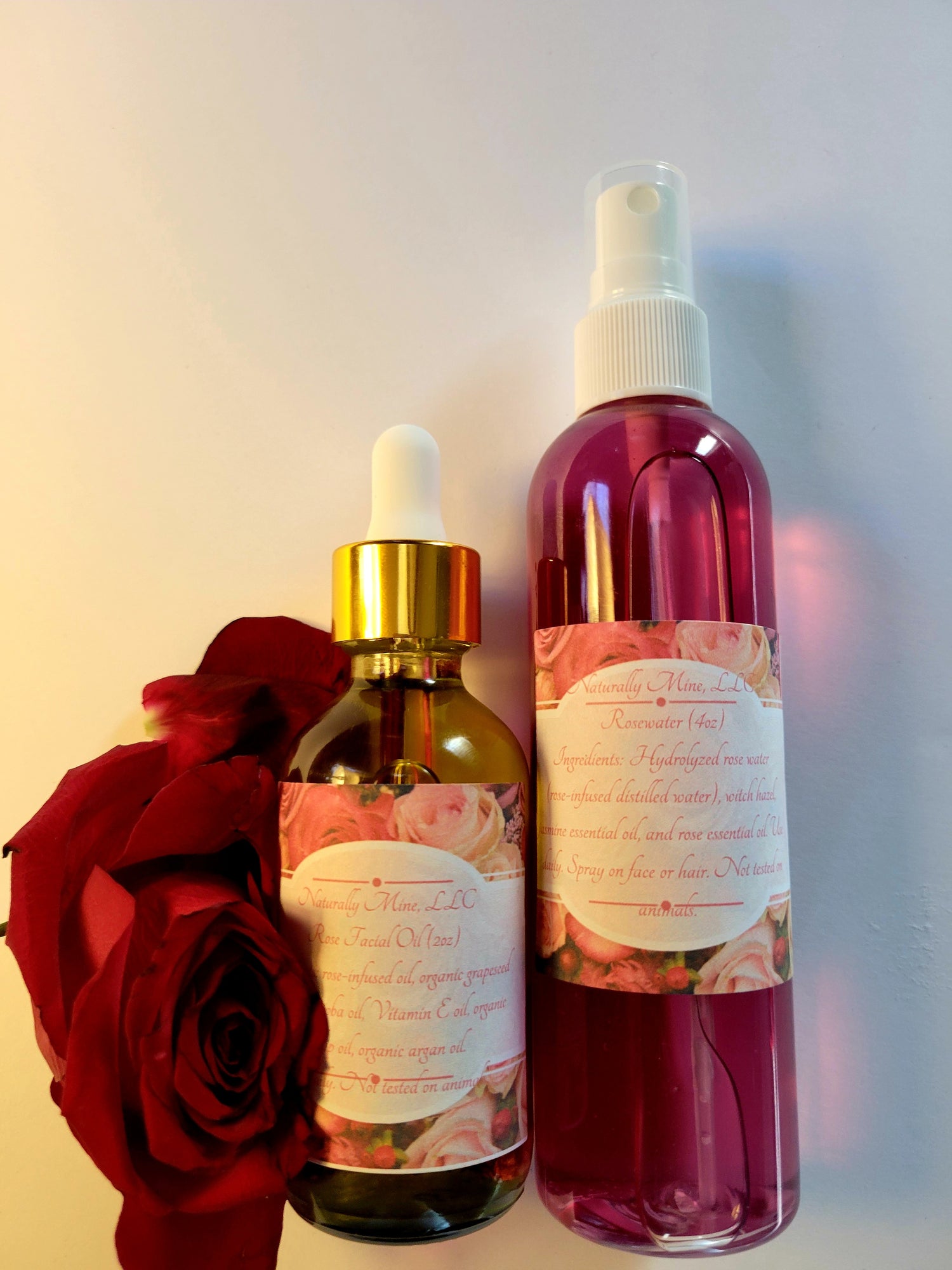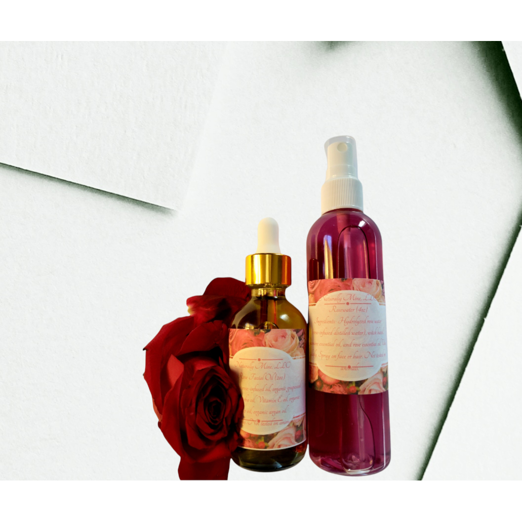 Made with rose-infused oil (organic grapeseed oil, organic jojoba oil, Vitamin E oil, organic rosehip oil, organic argan oil), and organic dried rosebuds.