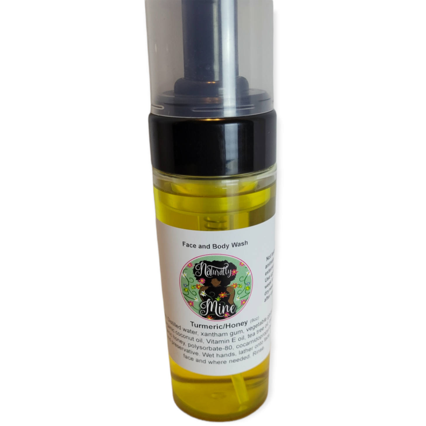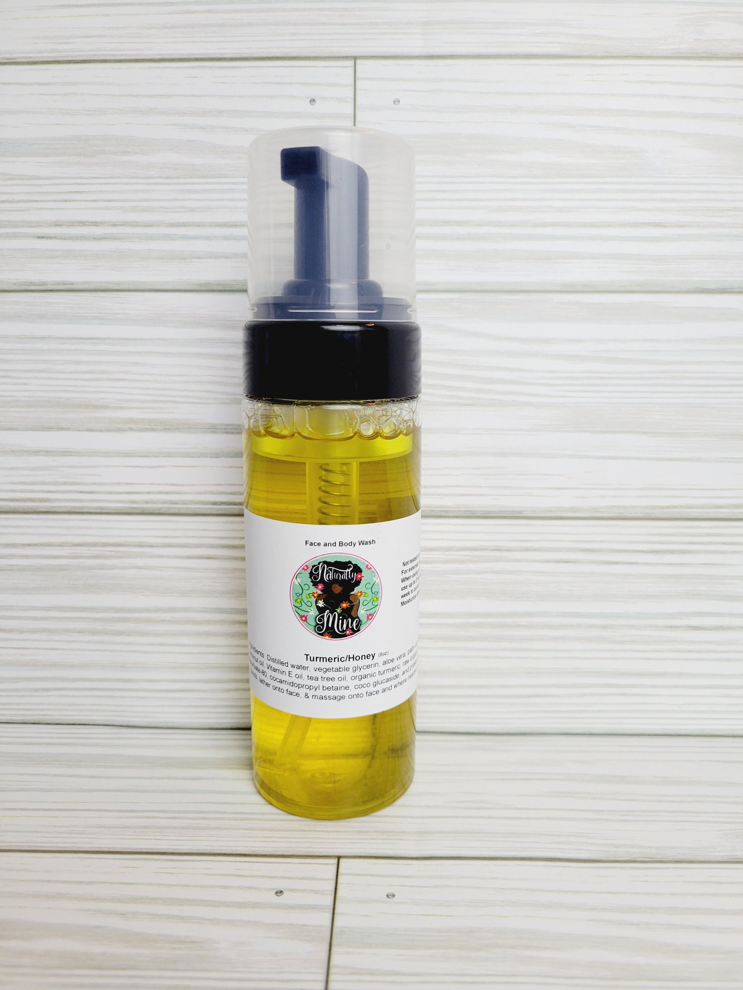 Ingredients: Distilled water, cocamidopropyl betaine, coco glucoside, polysorbate-80, vegetable glycerine, aloe vera, chamomile extract, organic coconut oil, Vitamin E oil, tea tree oil, organic turmeric, raw organic honey, citric acid, and preservative.